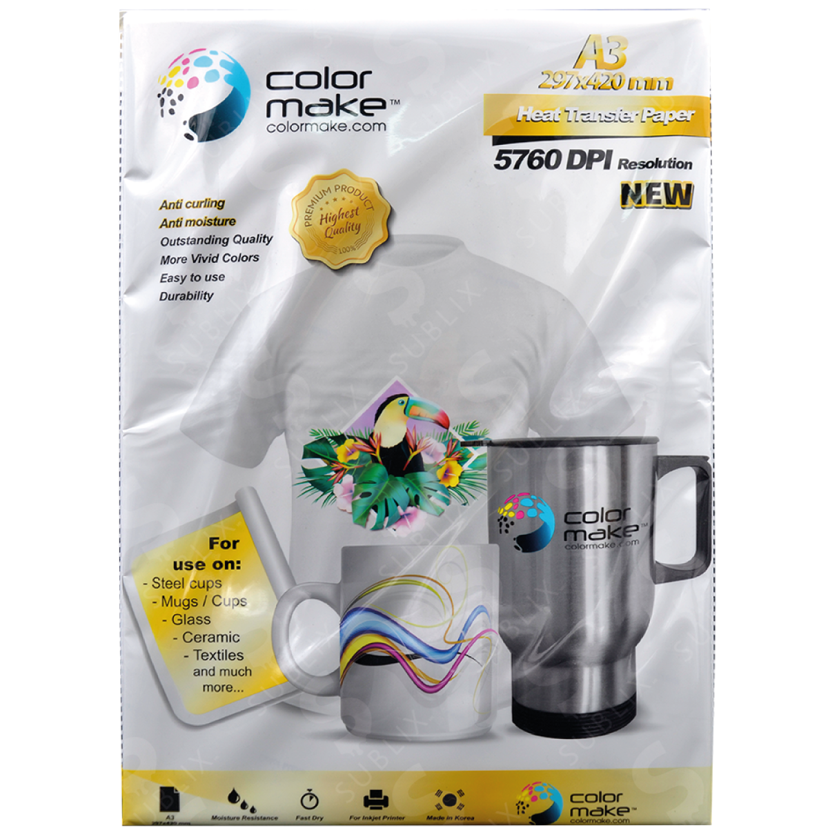 El Papel de sublimación A3 Premium Color Make es una herramienta esencial para transferir imágenes a productos promocionales con acabados impecables y secado rápido. Como transporte de la tinta, ofrece una base poco absorbente pero de excelente agarre sobre su superficie, lo que garantiza un 100% de transferencia de la misma hacia el blank u objeto destino.