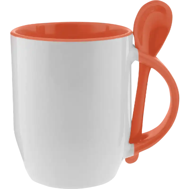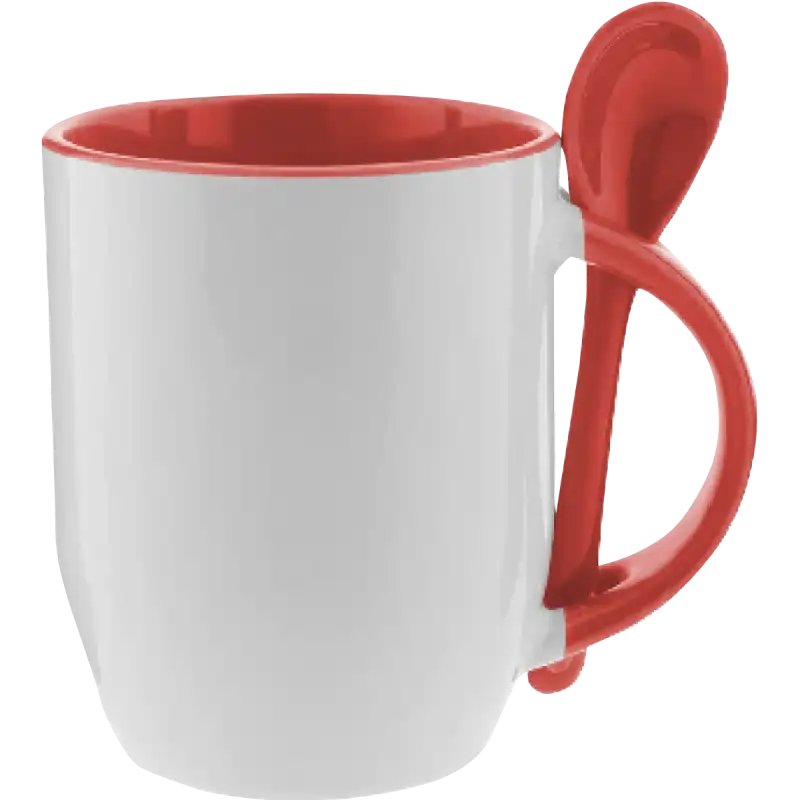 Taza blanca para sublimación con interior, asa y cuchara de color.