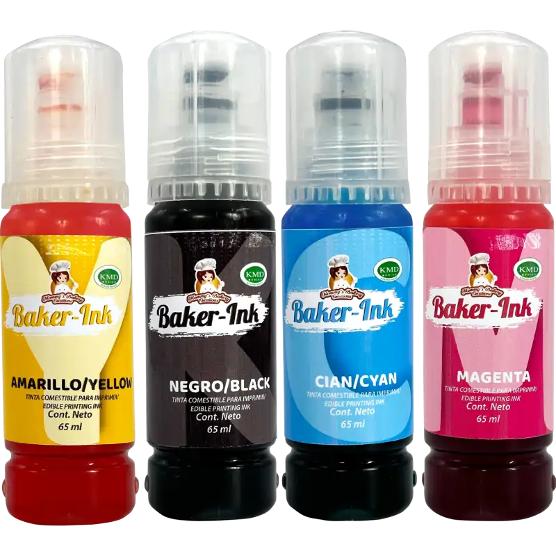 Baker-Ink de Mommy´s Bakery Creations son tintas de grado alimenticio diseñadas para usarse en impresoras con sistema de tinta continua (depósitos rellenables).